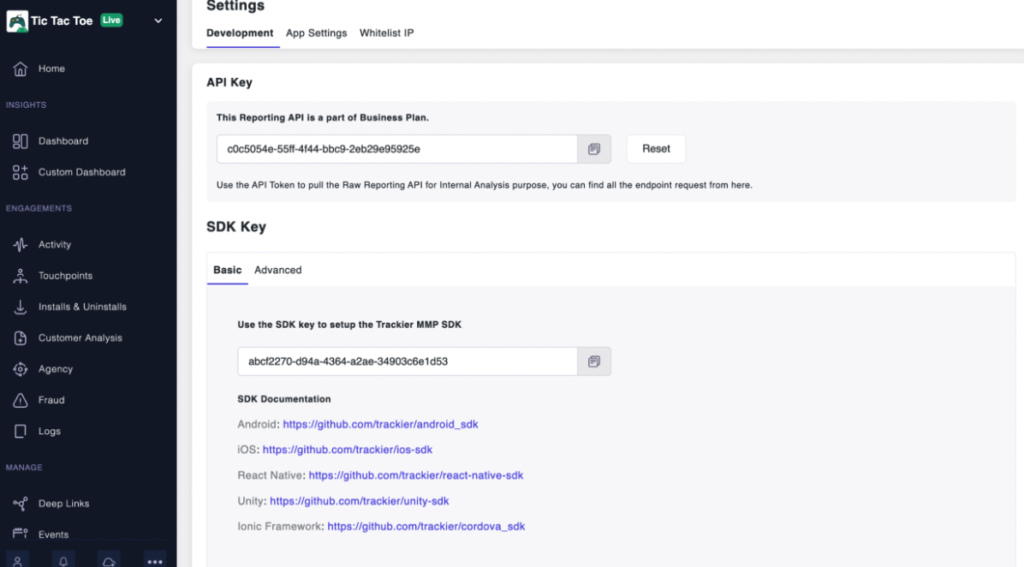 Within the SDK Keys section of the Settings/Development tab (under the Basic SDK Key), is your unique Basic SDK Key created specifically for your App. This key must be added during the SDK integration initialization process within your App source code.